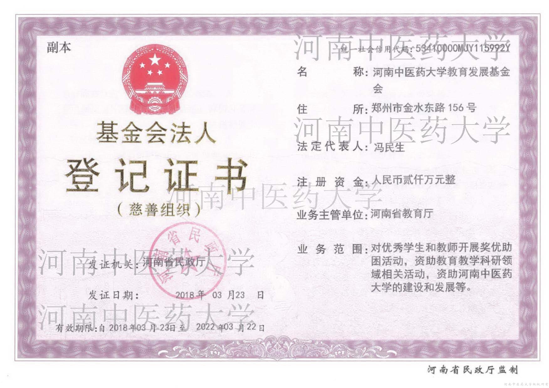 2018年4月10日,经我校申请,河南省民政厅正式向我校核发“河南中医药大学教育发展基金会”法人登记证书,批准“河南中医药大学教育发展基金会”成立。